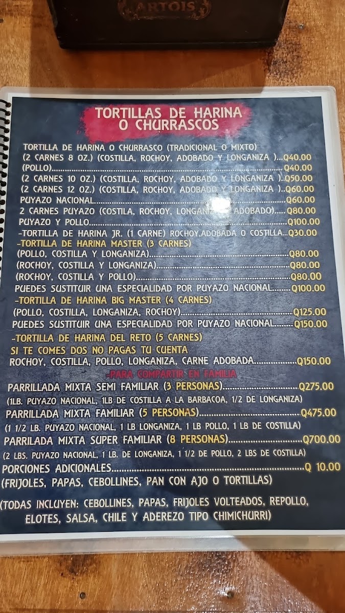 Grill lovers will especially appreciate the robust character of Puyaso, Puyazo Importado, and Churrasco Con Entraña, each showcasing careful grilling that emphasizes tenderness and natural meat juices without unnecessary complexity. Seafood also earns its place on the menu, with Camarones Al Ajillo offering a lighter yet aromatic option that contrasts nicely with the heavier grilled cuts. To accompany these dishes, a cold Cerveza fits naturally into the overall dining rhythm, reinforcing the casual, social atmosphere the menu suggests.